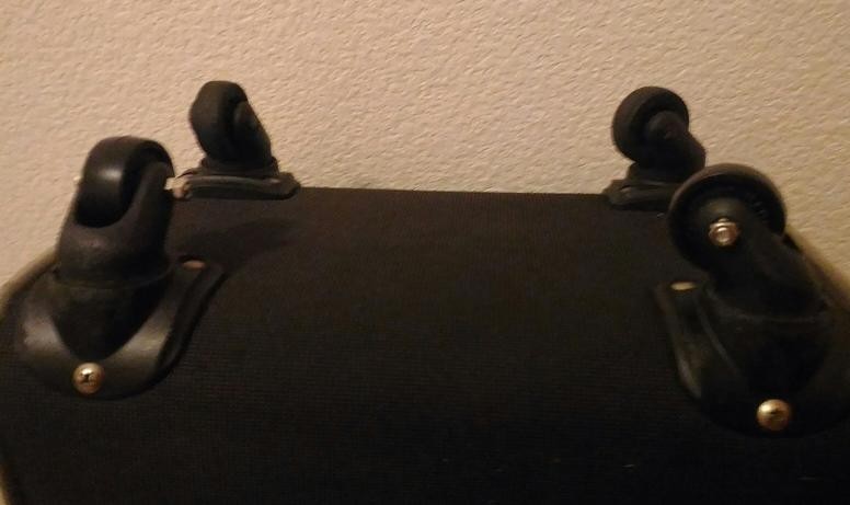 中型の飛行機であれば持ち込めるが、この前小型機に乗るときに預けるときに空港職員に指摘されたキャスターの破損。右手前がすり減っている。奥のは何ともない。