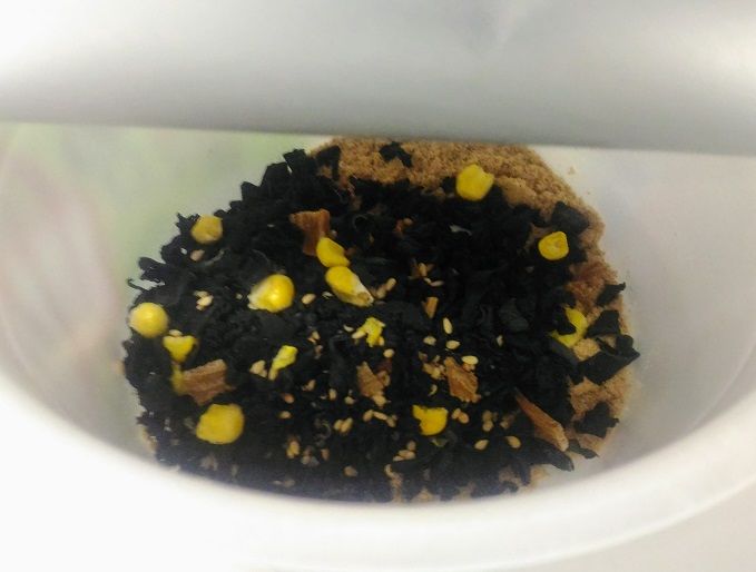 器の中には具とスープの袋が二つ。投入したところ。