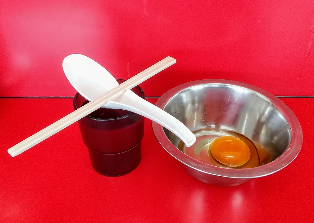 カウンターに案内されて、お冷とレンゲを取ってきたら生たまごが到着してました