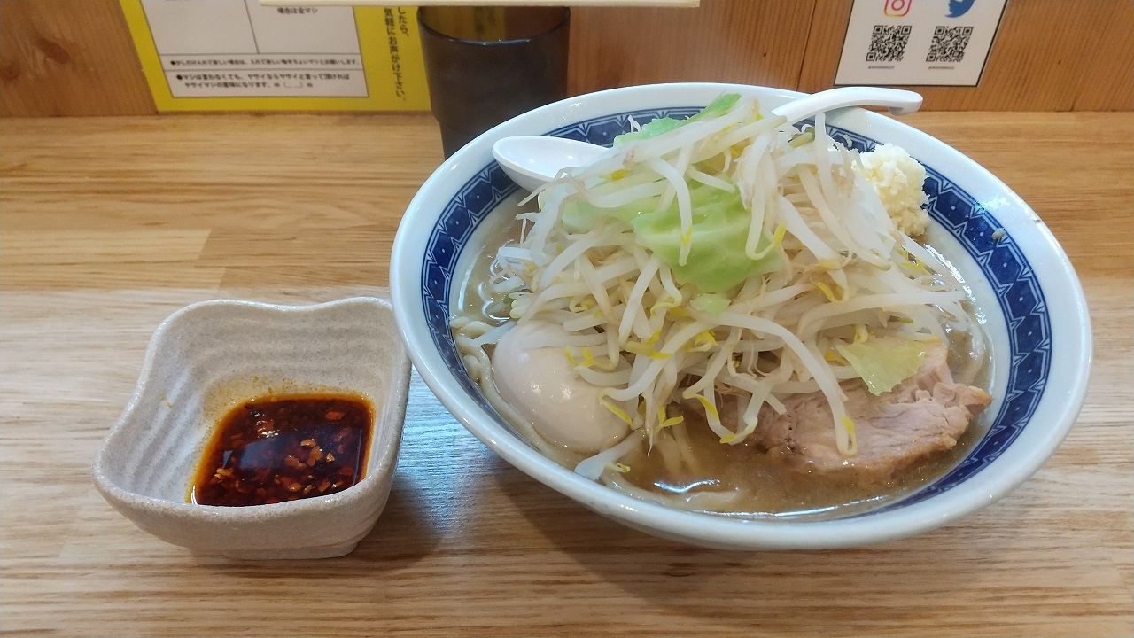 ラー油を初っ端からヤサイにかけて、ニンニクと一緒にスープに浸すと美味い