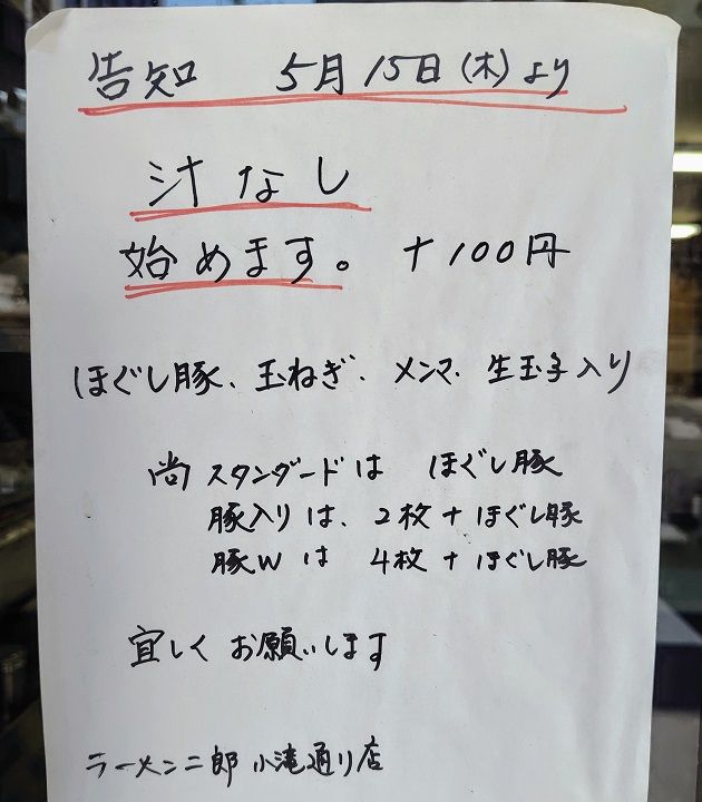 食券と合わせて現金100円を出して汁なしをオーダーしました
