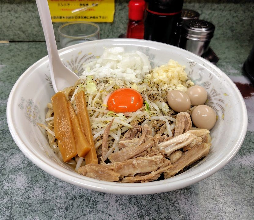 汁なしは野菜に生卵、ニンニク、ほぐし豚、メンマ、刻みタマネギが載って黒コショウが散らしてありました